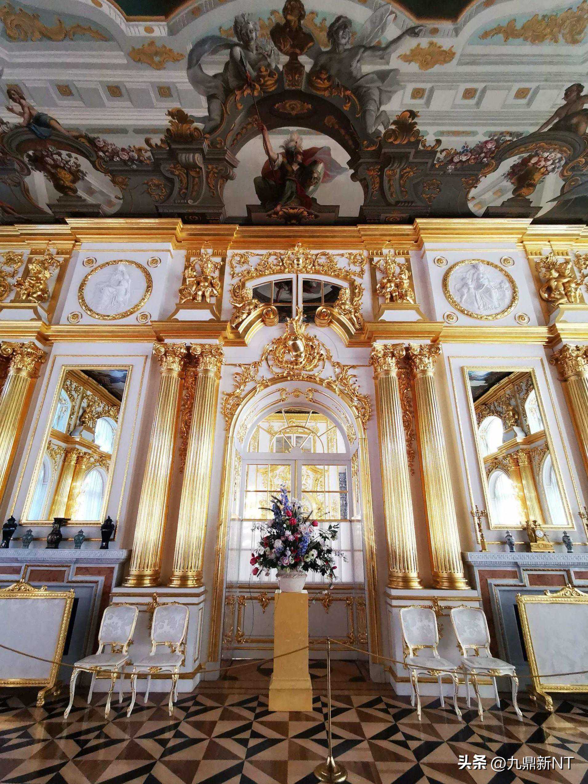 然而它的精华在于奢华的内饰,金色走廊、接待大厅、宴会厅、肖像厅、红绿柱厅等,随处可见令人眩晕的金灿灿让你一目了然地了解什么是“无金不巴”的巴洛克式装饰风格。其中最令人叹为观止的是琥珀厅,厅内墙面镶嵌满重达6吨的琥珀与名贵珠宝,闪耀着让人窒息的柠檬黄到金红色。可惜二战期间被德国纳粹洗劫一空,现状为复原后的面貌。