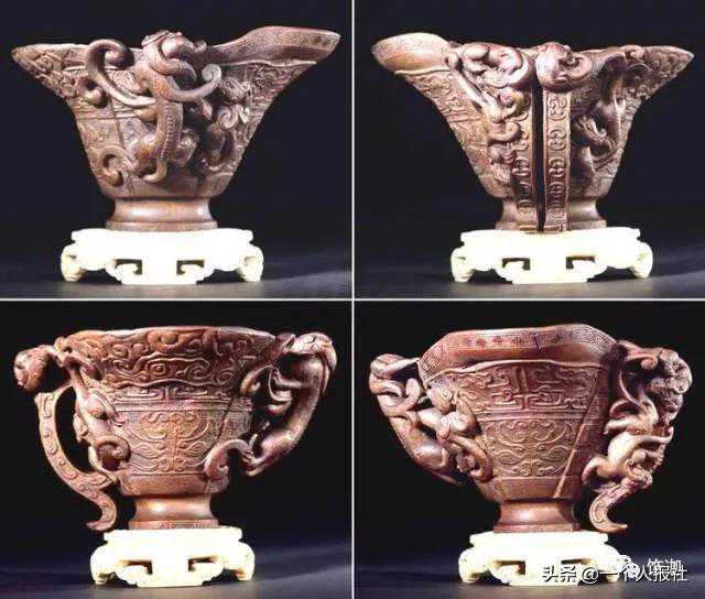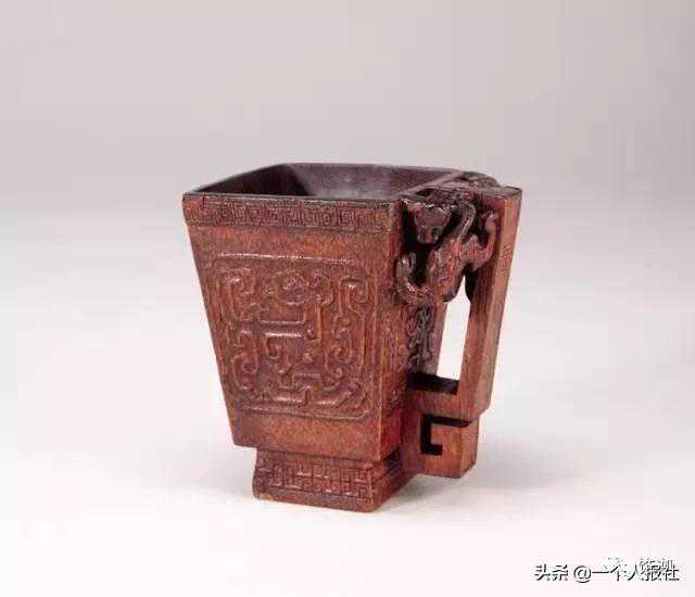 杯用犀角雕成,大口沿,方唇,口沿饰有回纹装饰带,杯耳由对称的两条夔龙构成,杯身犹如挂角方斗,满饰仿青铜器的饕餮纹,杯下承三足,此器为仿古造型,纹饰繁复,反映出作者浓厚的文化底蕴和高超的雕刻技艺,表现出宫廷艺术追求精致的物质。