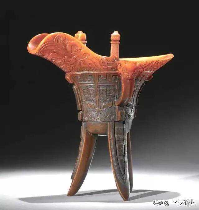 此犀角杯为爵式杯,整块琢雕,色呈琥珀,泛黄褐,上浅下深,微透光,采用深浮雕,间以透雕技法镌制而成。以一只硕大的犀角掏挖雕就,敞口,两侧雕塑数条螭龙纹,攀爬于杯身两侧,身躯健壮,面目凶悍狰狞,指爪犀利,尾羽飘逸,将螭龙的矫健和苍穹表现的淋漓尽致,杯身通体仿效战汉青铜纹饰,以剔地浅浮雕的手法雕刻,图案纹饰以抽象的兽面纹,又极具抽象效果,雕刻精湛。