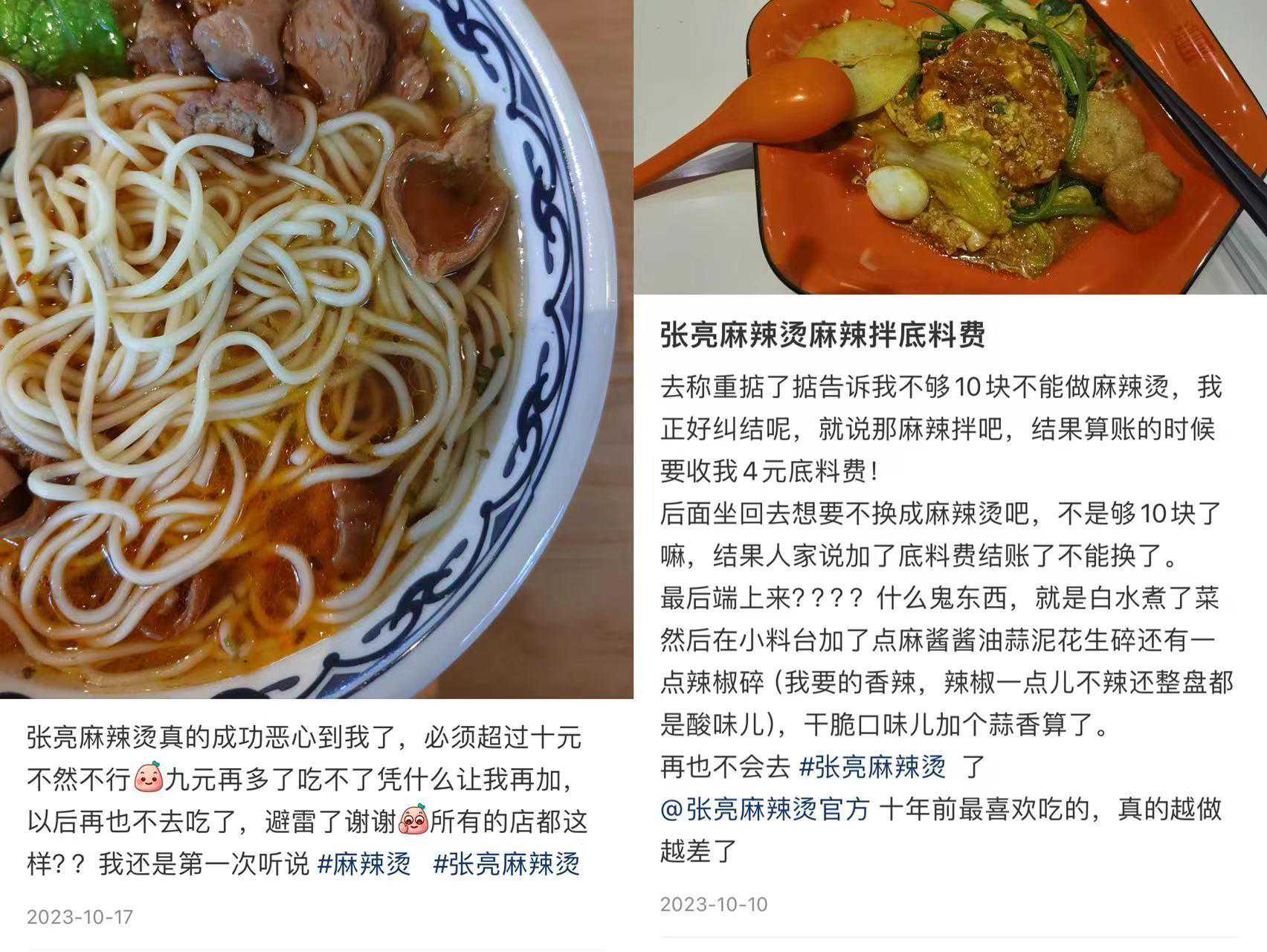 3月25日晚,南都湾财社记者在社交平台已经搜不到该帖子了,不过,记者留意到,在社交平台上,部分消费者对于张亮麻辣烫汤底收费持有异议。如2023年10月,就有消费者吐槽,有的张亮麻辣烫门店必须让顾客点满超过10元,“再多了吃不了凭什么让我再加”,还有顾客吐槽称,门店店员称不够10块不能做麻辣烫。