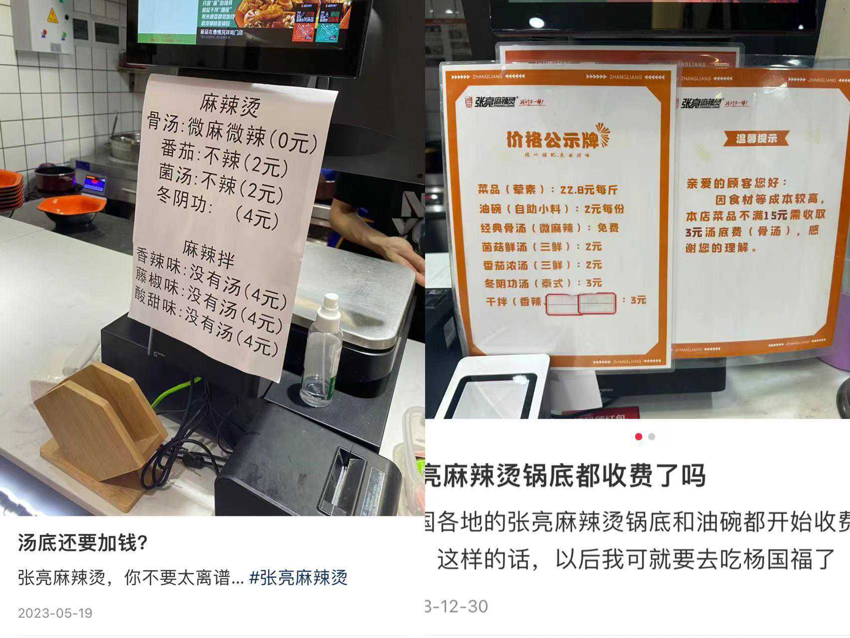 3月25日,有媒体报道称,部分张亮麻辣烫门店公示,餐品不足10元会多收取2元汤费,此事引来消费者吐槽。同日晚间,话题冲上热搜第一。