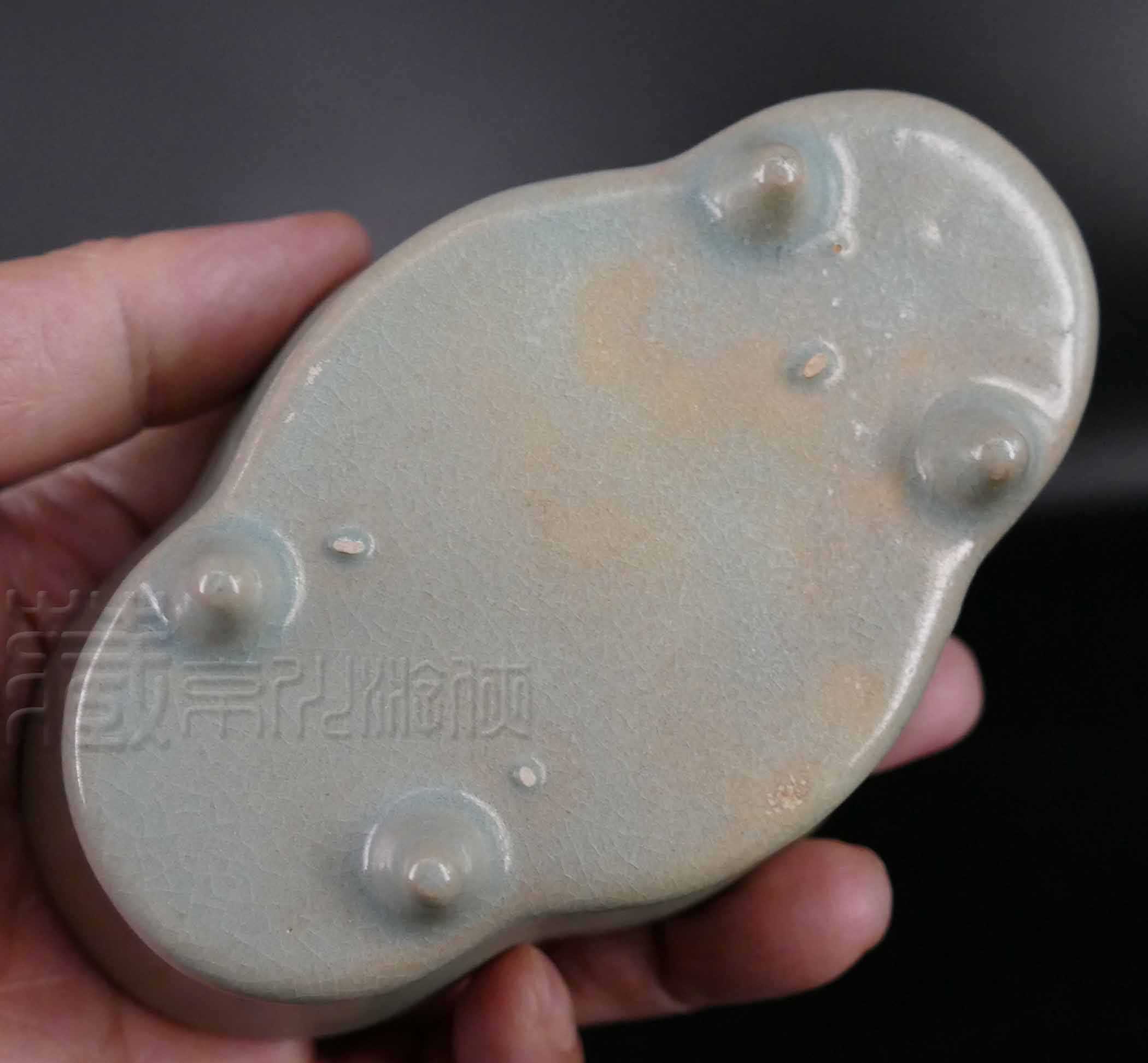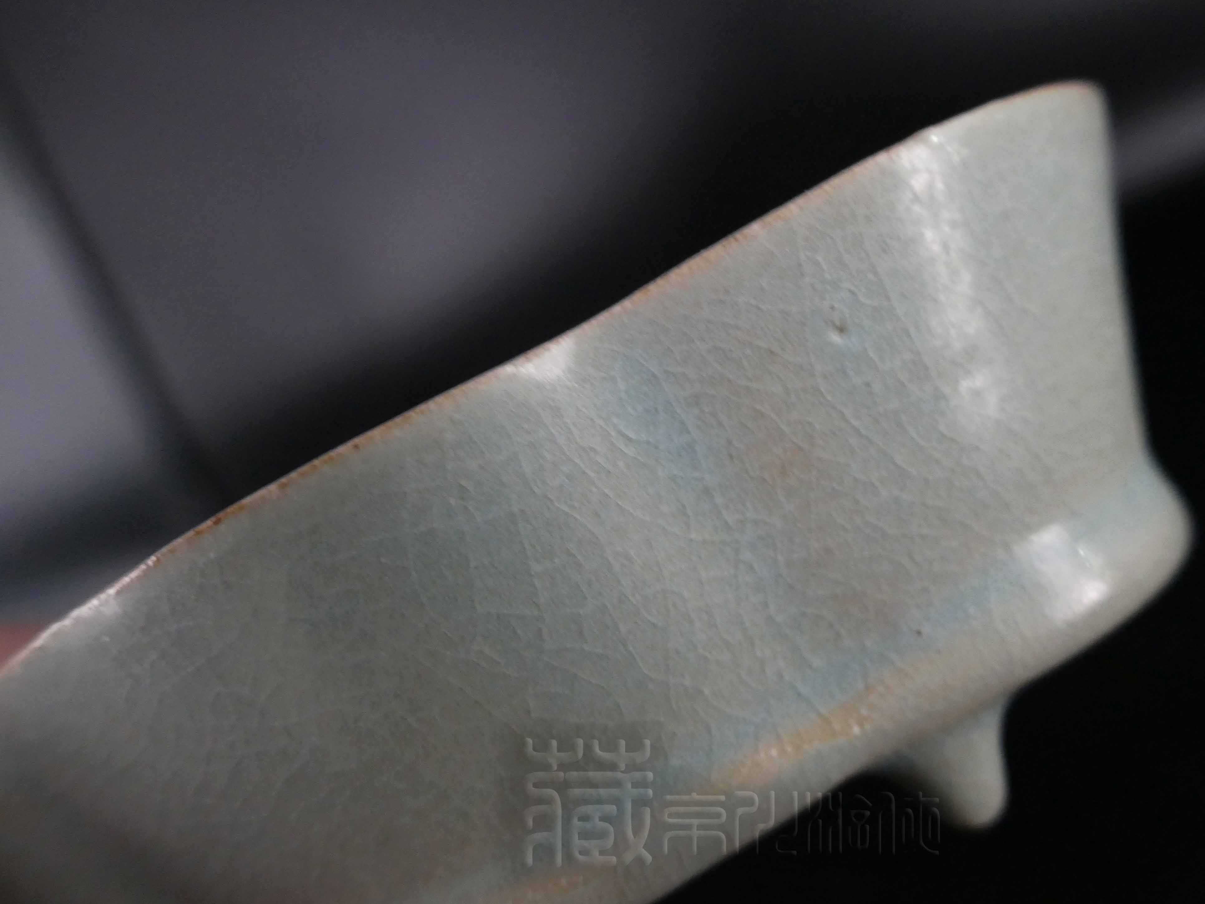 鉴赏本品。可见其乃四足长形花口洗之器形,长约13.2厘米,高约4.2厘米。其制作规矩,灰青釉色,正是汝窑釉色典型之一。续可察其釉色已呈亚光质地,浑身上下凸显温润之感,可见缕缕开片纹线,土蚀土沁较为深重明显。其中,亦见局部钙化斑驳之痕,疏密不一,更见通体包浆老润滋和,实乃冰冻三尺,非一日之寒所能成矣。再观摸其胎,胎体厚薄均匀,是为明显之香灰胎色,更不在话下。其中,可见其底三粒微小的支烧铮钉痕,其形更是极为典型的芝麻之形,北宋汝器应有之特征。故以其釉色包浆,诸般质色质地乃至鉴别要点来看,此花口洗彰显北宋真汝之相,谓之大门洞开,毫不虚妄矣。