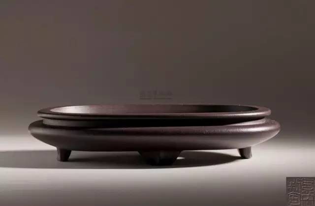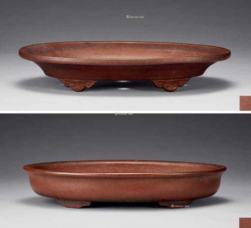 花盆以上好紫泥制成,呈椭圆形,唇口出沿,扁圆腹下收,下承四扁足,盆内有圆孔二个。花盆为历代帝王皇室、文人雅士所钟爱,被例为书房陈设不可缺少之物,特别是一些制作精巧玲珑之器更是受到倍加推崇。在清宫历代藏品中紫砂器不再少数。此件作品制作之精细,造型之完美在紫砂器中堪称一流,在顾景舟先生作品中也属少见之物,极为难得。