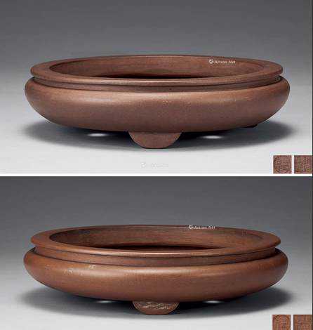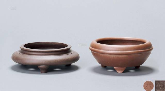 说明:三角炉顶盆:紫泥中掺有黄砂,鼓腹平底,口部线条为平圆形,三圆足支撑,似炉似鼎,庄重古朴。扁圆腰线盆:圆盆,鼓腹,口内敛,底部亦内敛,腹中部饰有一外凸圆线条,底部三足。