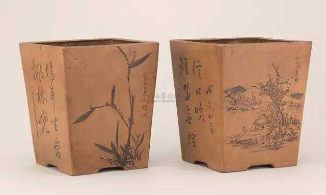 花盆选用紫砂制作。盆口大底小,盆壁斜直,底内凹。盆上均绘有图画,且有诗文题上。两盆诗文书画皆不同。一盆正面绘就田园风光图,上有题款。田园风光旖旎,茅舍一间,远近皆有树木,高高低低,或繁茂挺拔,或远伸斜逸。山峦起伏,层落分明,延伸有势。茅舍近处有一人活动,似颇自在。整幅图画显示是恬淡安静的人文风光,高雅脱俗,用笔不凡。盆的另一侧书有“短笛无腔信口吹”、“戊午初夏”字样,正衬托图画的自然和谐、从容平淡,具有强烈的艺术感染力。另一盆主绘为一竹枝,竹节分明,竹叶清晰,清雅俊逸之风扑面而来,形象逼真,映目清神。旁有“停车坐爱枫林晚”字样,并有落款。显示出了制器者出世独立、向往山林的艺术襟怀。整个花盆制作大气精雅,书法绘画造诣颇深,体现出民国匠人的一流水准,是当时佳作,如今珍品。