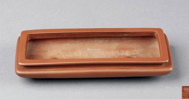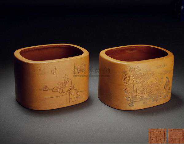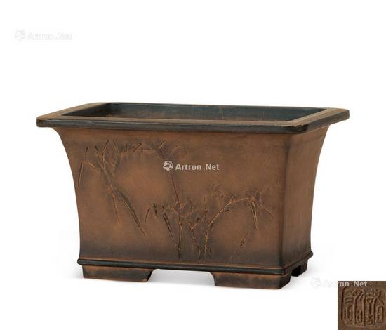 说明:紫砂制。呈长方体,深腹,矮足。一面刻“谡谡似松风立,朗朗似玉山上行。东溪刻”。整器方正规整,古朴大方。