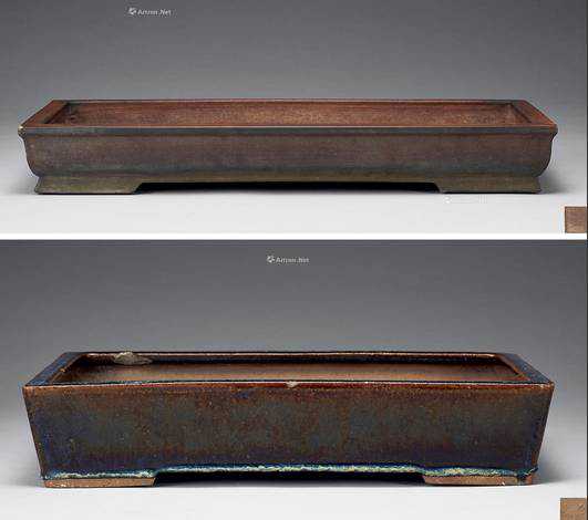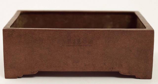 说明:此盆为长方形,倭角口沿,腹部略弧,转角处起筋,如意云脚外侈,底部有两圆孔。质地细腻,粗中有细,呈古铜色。体量虽小巧,然造型大方,张力十足,有盆中之王者风范。底部钤印“少峰”篆书款,印迹清晰有力,深浅匀称。