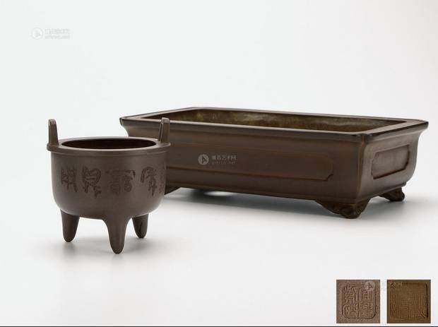 说明:此组花盆一圆一方,用料考究,细看之下,颗粒明显,包浆深厚,品相极佳。长方型盆,盆口外折,口沿起线,盆体四周开光,如意云纹足,坚实立挺,盆底开两大四小出水孔,钤“金华造印”款识;圆盆呈香炉式,口沿左右各起一桥型方耳,盆底接三只乳钉足,开三孔出水,程品字形排列,底部钤“宜兴紫砂”款识,腹部镌刻“时在乙亥年之夏友石氏书于东坡南窗”字样。