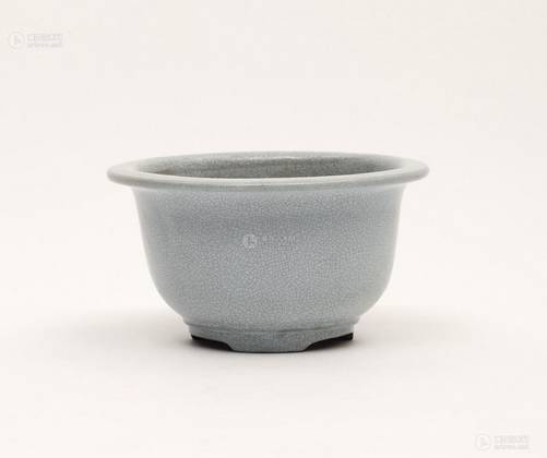 说明:清蓝浦《景德镇陶录》称为:「仿肖古名窑诸器无不媲美,仿各种名釉无不巧合。」此件仿哥釉紫砂盆,釉面发青灰色,清新雅致,釉质厚润,釉面有宋哥釉那种油腻酥光似的皱纹,而且通体满布青釉开片,粗纹色黑,细纹色黄,犹如「金丝铁线」,匀称美观。此器端壮周正,色泽纯美,典雅而不失苍劲古朴之感,耐人玩味。