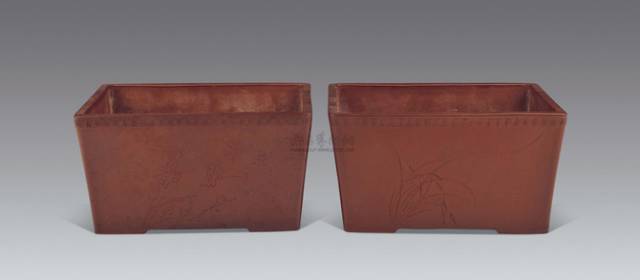 此对紫砂花盆形制相同,平面近椭圆,口沿收,腹壁直。一只花盆上刻画有三顾茅庐的故事,并刻《梁父吟》“一夜北风寒,万里彤云厚;长空雪乱飘,改尽江山旧。仰面观太虚,疑是玉龙斗;纷纷鳞甲飞,顷刻遍宇宙。骑驴过小桥,独叹梅花瘦”诗句。落款“癸巳冬月,东溪生刻。”另一只花盆一面刻有案前读书,上落款“东溪生刊”。另一面刻“熹风催嫩蕊,湛露渥繁枝”,落款“东溪”。两个花盆底皆有“曼陀华室”、“心舟”铭印。何心舟:号曼陀华馆,清道光至光绪年间宜兴制壶名手,与海上画家任伯年、胡公寿、虚谷等书画家常相往来。曾与王东石于浙江宁波建玉成窑,凡其所出每见奇品,极具文人品味。赵松亭,曾用名支泉,艺名东溪,宜兴蜀山川埠上袁村人,清末民初著名紫砂艺人,实业家。民国初年,其先后研究各种釉色,在紫砂器物上施以贴花挂釉加彩等技法,并获得成功。