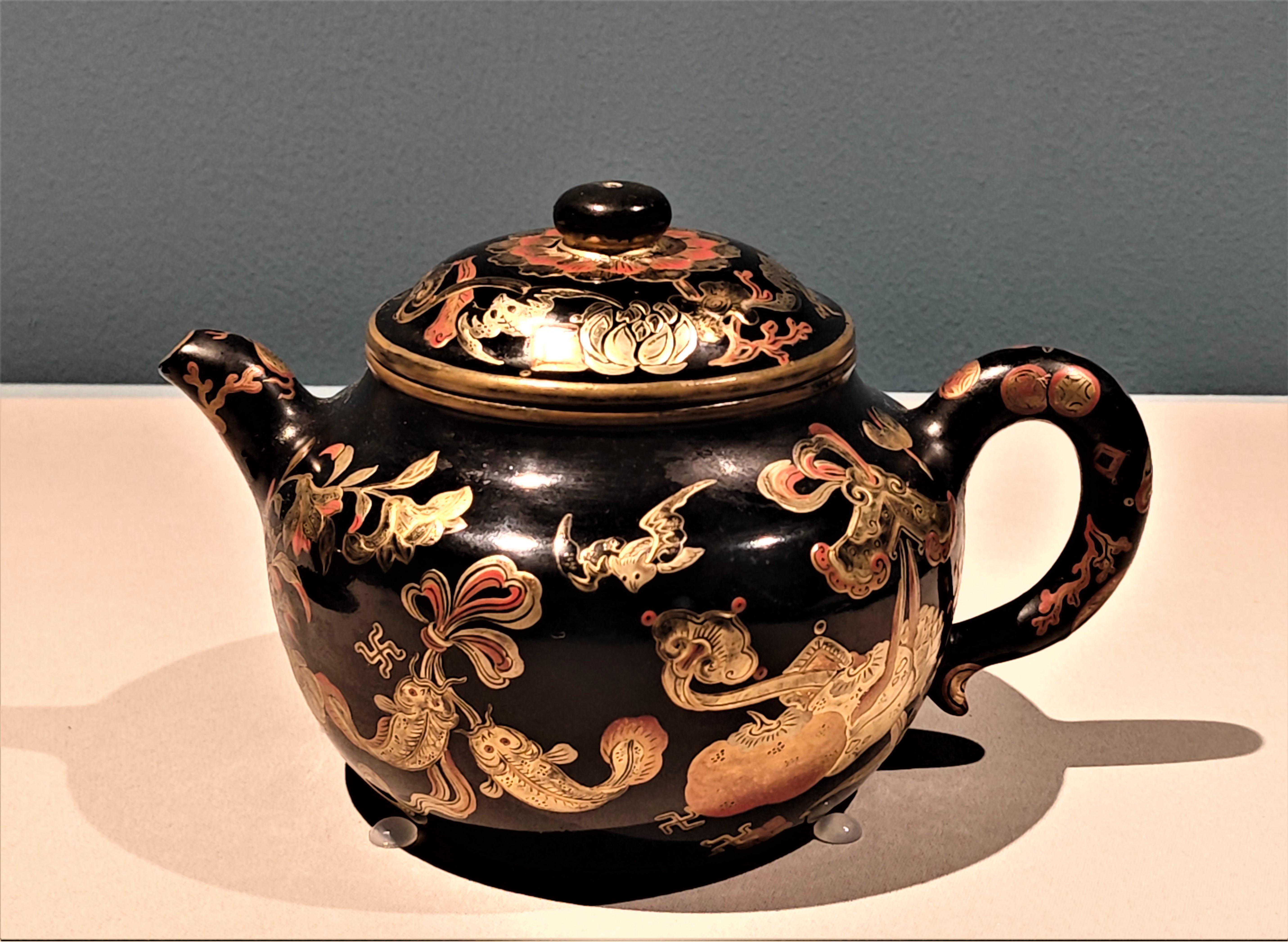 展览中还有来自英国、日本、俄罗斯的茶器精品,还有清代宫廷中使用和收藏的来自异域的茶器,以及由清宫造办处制作的外国风格的茶器。比如:故宫博物院收藏的日本银鸢尾花纹茶具套装、法国蓝釉描金寿字纹茶具、俄罗斯银刻花双耳六足盘,以及维多利亚与艾伯特博物馆收藏的“中国风”茶具、英国沃克斯豪尔瓷厂烧造的软瓷印花青花庭院图茶叶罐、德国麦森瓷厂烧造的红陶模印花卉纹壶、珐琅彩描金人物图杯及杯托等。