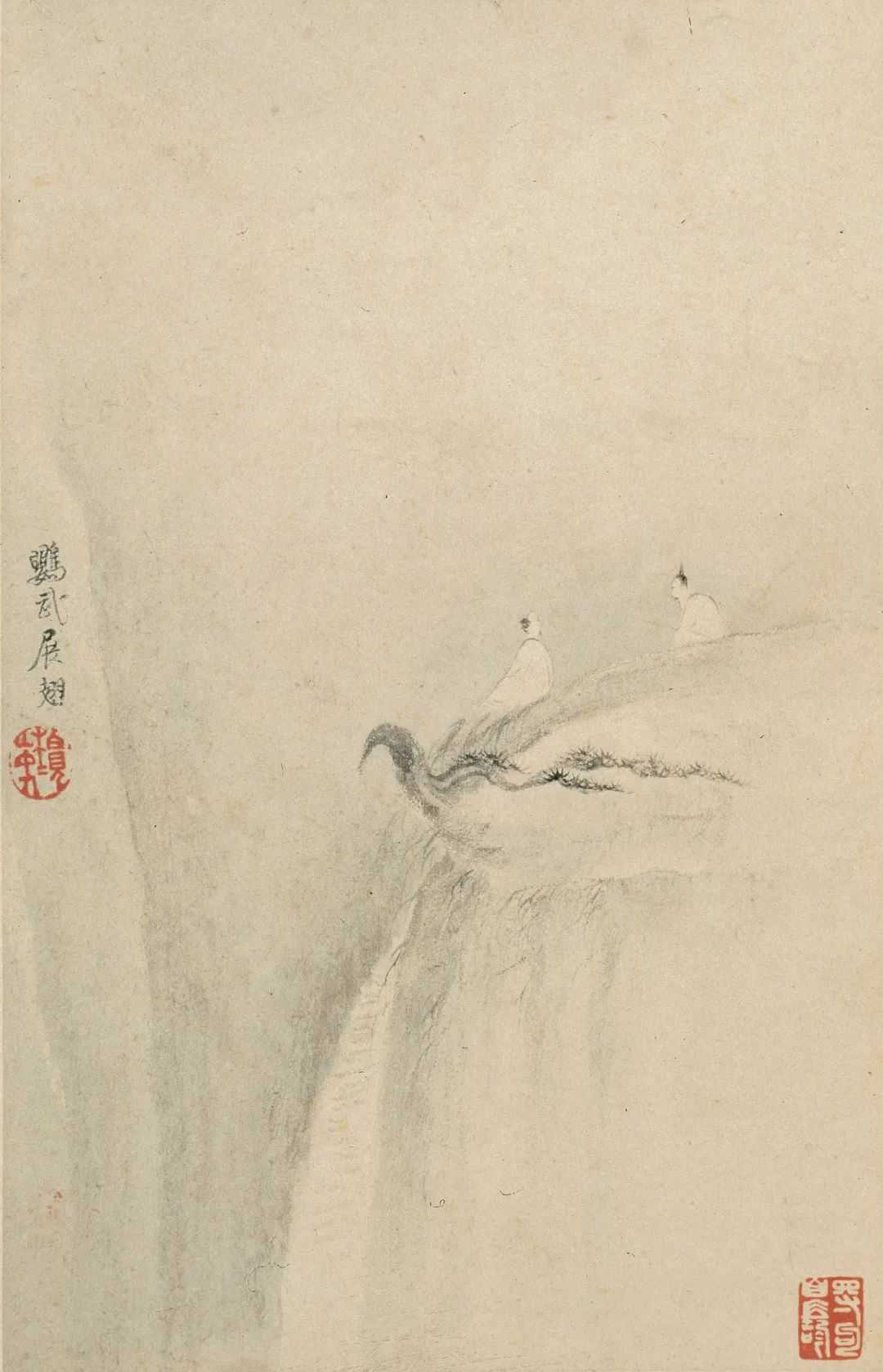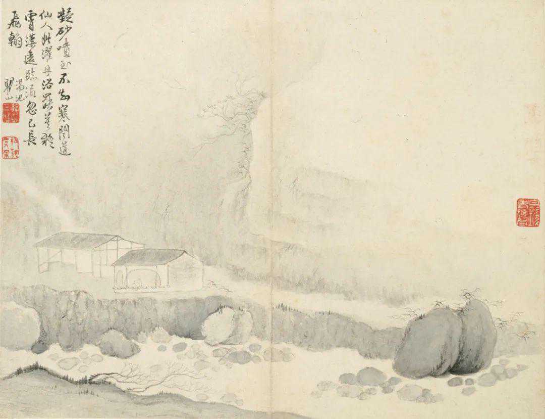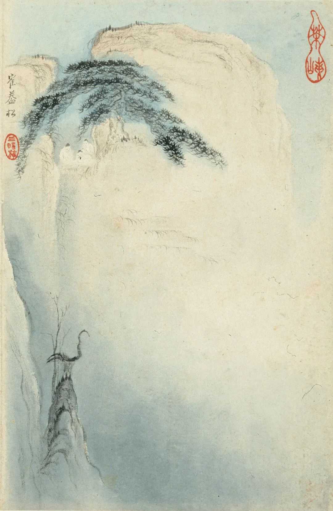作于1693年的《黄山十九景》,是梅清正值七旬,创作巅峰期的代表作。在这十九帧画页中,梅清以恬静幽深的细笔淡墨洗练地勾勒出黄山遗世独立的缥缈仙境。那些在云雾中独坐鸣弦或对弈遨游者,与山林间的氤氲仙气互映为脱尘之致,恍惚间已经远离了人间烟火。