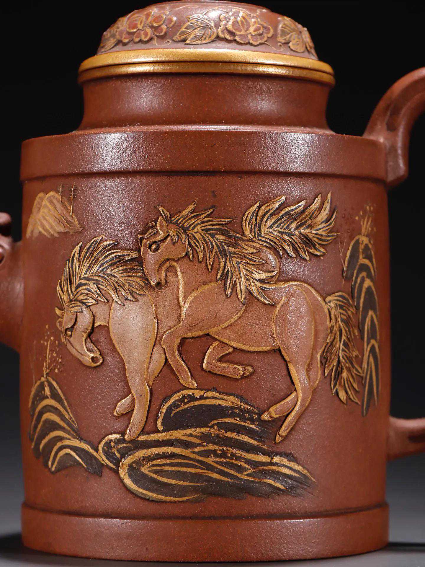 原矿老紫砂料考究,砂质细腻均匀,壶形端庄雅致,堆雕双马图,纹饰描金,纹饰精美生动,落款清楚,做工一流,包浆古朴醇厚,收藏极佳。