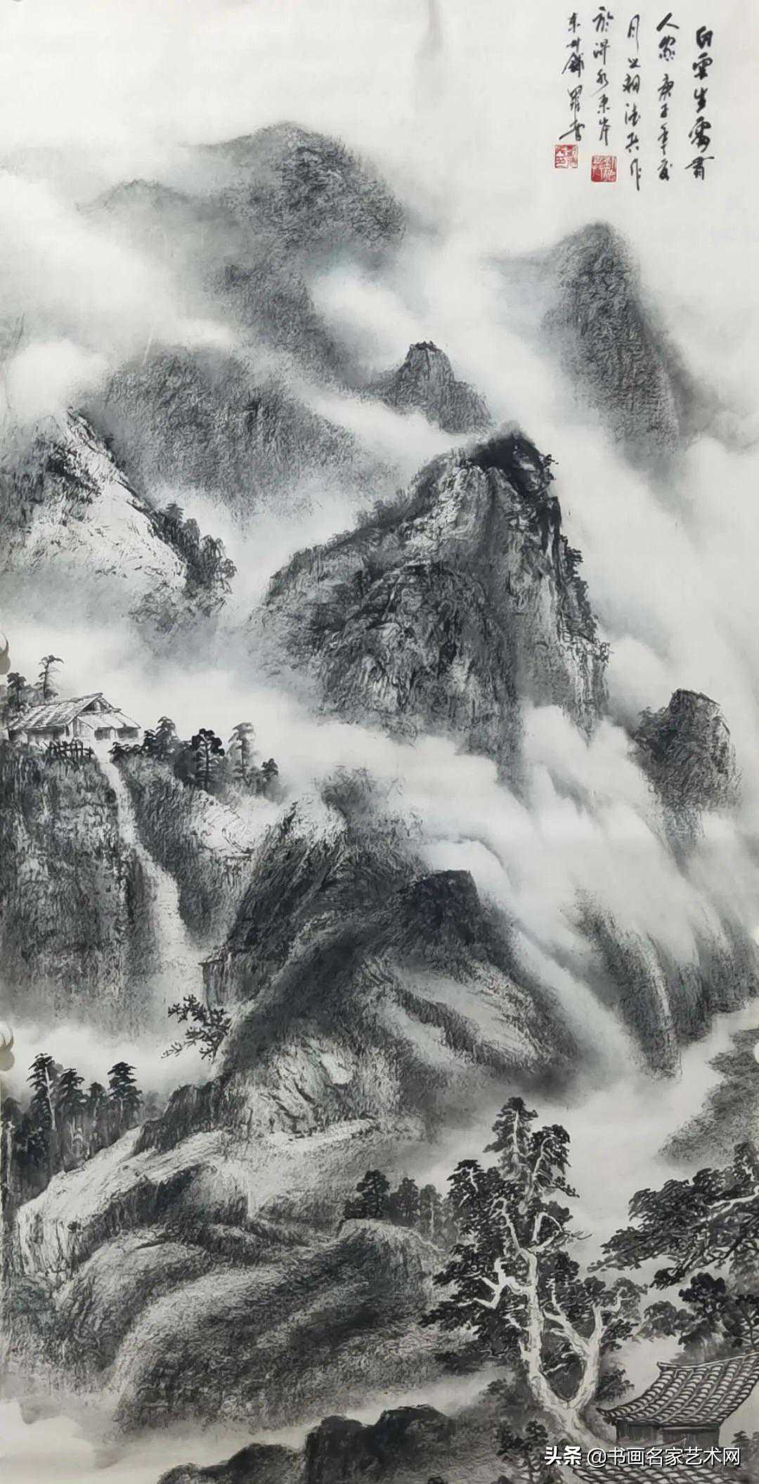 刘德兵的画作,在极力保持传统山水画正宗文脉的前提下又有创新性独特的美感,呈现出自然的气息与内美。在平凡自然中发掘出诗意和情趣,以浑厚灵动的笔墨功底,传递的是忘我的山水情怀,表达了人与自然对话的诗意感悟。刘德兵的画题材广泛,将蕴藉生命内涵的大自然情感化,澄怀观道,既有山峰林立、傲然直耸的气韵和天险之势的壮美,又有巍巍太行、大漠深处、雪域草原等主题的创作,还有江南水乡、山村小景的描绘,在水墨间流动,在画纸上奔腾,层层青嶂一碧如烟,飞瀑挂天,浩然缥缈,美得让人心醉。
