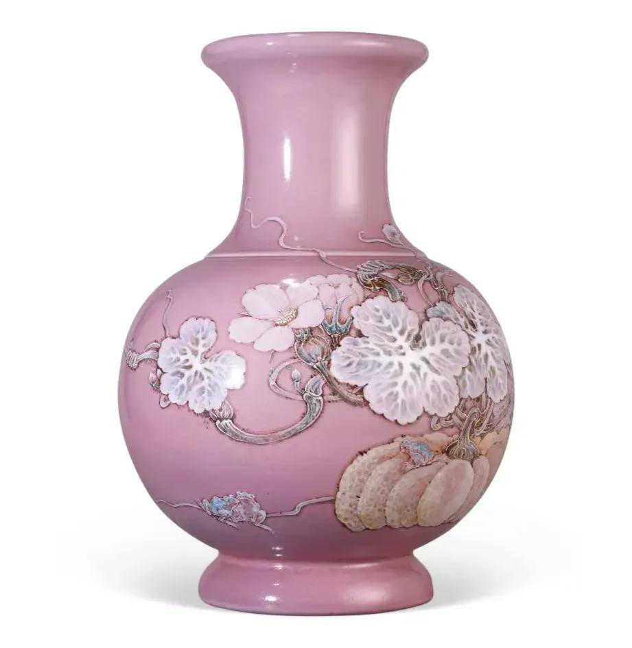 本件桃红釉高温堆白加彩《高歌丰收》南瓜尊,是景德镇市著名陶瓷美术家,王步大师五十年代中期的作品。桃红釉堆白加彩,是五十年代景德镇市陶瓷装饰的创新门类。本作品用高温白色料,采取厚薄对比的方式,体现出所画物体的质感与明暗交错,再加以高温颜色渲染出画面的色泽;使得整个画面具有浮雕般的立体效果。王步先生亦如其画青花作品一样,用顶头鼠尾般的线条勾勒出来南瓜茎叶和青蛙的轮廓,用厚薄对比替代青花分水般的效果;来表现南瓜茎叶和青蛙的肉质感。再加以色彩渲染使得整个画面活灵活现,栩栩如生。茂盛的茎叶下,一个巨大的成熟了的金色南瓜坠在地上,一只可爱绿色青蛙趴着南瓜上,俯看着地下的两个同伴,仿佛在听它们说悄悄话;又或是羡慕着它两亲密融洽的相处。南瓜的茎蔓向两边攀延生长着,一边不断的开着花,结着大小不同的南瓜。整个画面生机勃勃,祥和温馨。演绎着丰收的喜悦心情和美好生活状态。